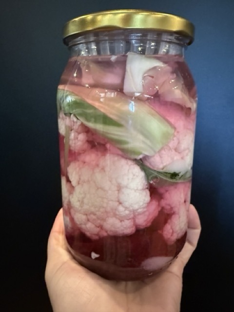 Unter Roberts Anleitung bereiten wir zwei Rezepte vor: klassisches Kimchi und Blumenkohl, der durch ein Stück Rote Bete eine wunderschöne pinke Farbe annimmt.