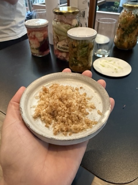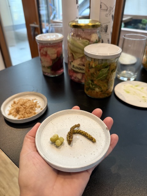 Grau ist alle Theorie (wusste schon Goethes Mephisto), deshalb geht es im zweiten Teil in die Praxis. Vorher dürfen wir uns durch die Vunky-Schatzkammer probieren: Neben Klassikern wie Rote Bete oder Blumenkohl überraschen mich fermentierte Birkenpollen, Kapuzinerkressesamen und ein „Eis-Schnee“ aus Kaffeesatz-Kombucha.