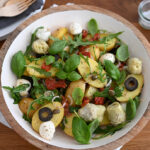 Italienischer Kartoffelsalat mit getrockneten Tomaten, Kirschtomaten, Mozzarella, Artischocken, schwarzen Oliven und Rucola. Getoppt wird der Geschmack dann noch durch ein Dressing aus Zitronen und zerstoßenen Fenchelsamen. Was für eine Geschmacksexplosion!