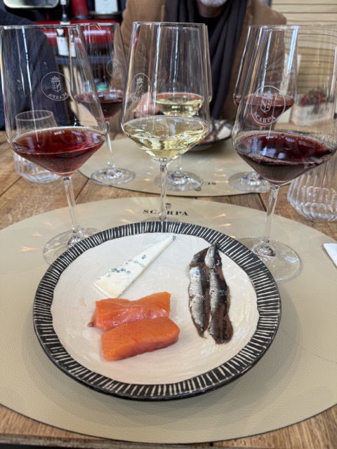 Dass Tradition nicht gleichbedeutend mit ‚verstaubt‘ ist, zeigt auch das Foodpairing, das Scarpa uns in seinem modernen Verkostungsraum zum Lunch serviert hat. Unkonventionell, modern, mutig, fand ich das: zum Beispiel der süße Moscato d’Asti mit seiner ganz feinen Perlage, einem intensiven Aroma von Holunderblüten und Honig zu gesalzenen Sardinen. Krasse Kombi, aber richtig geil.